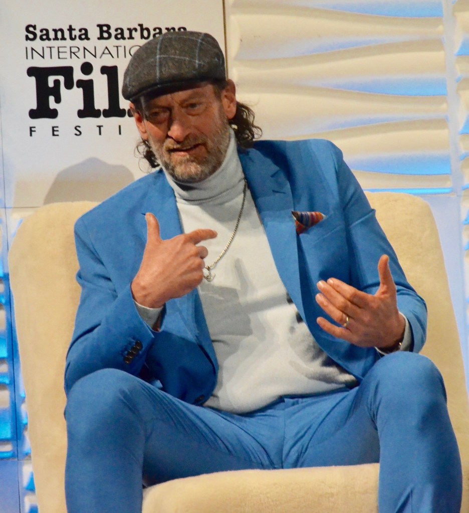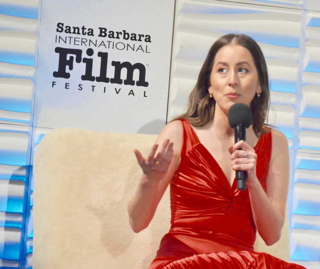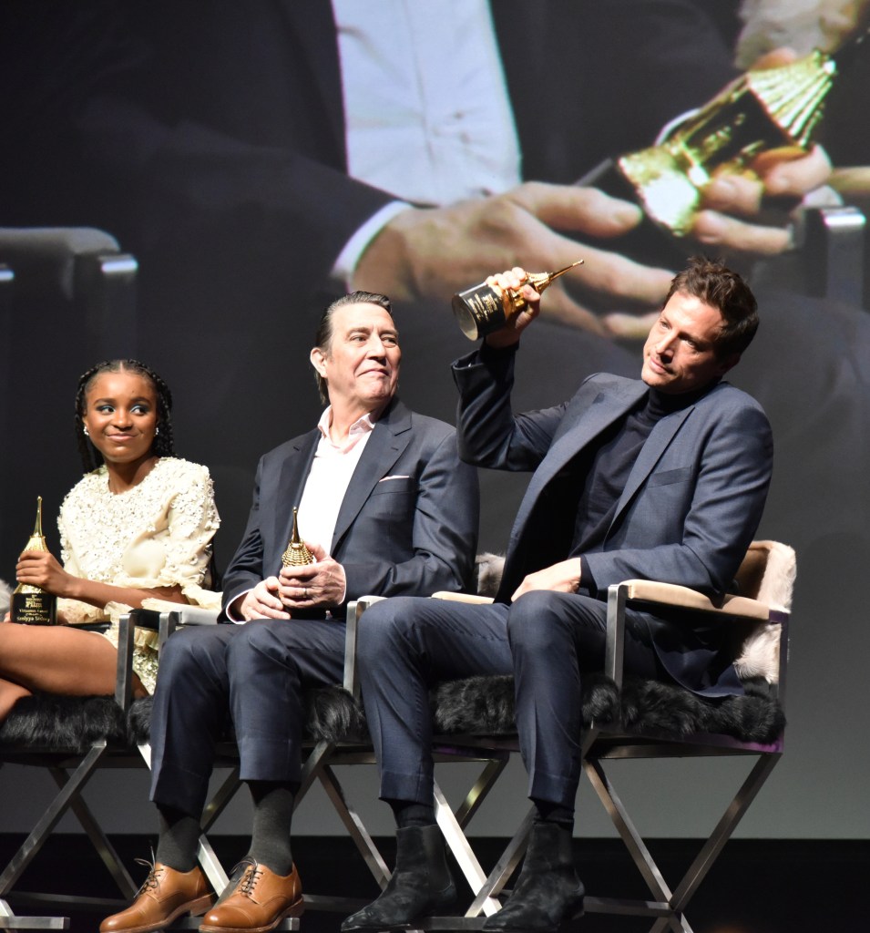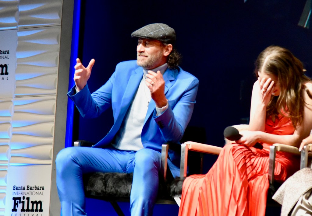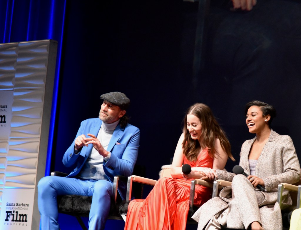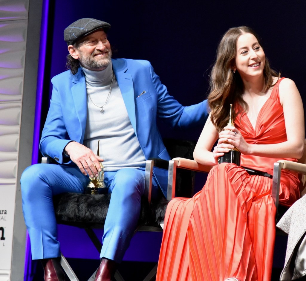 The next event was one of my favorite nights of the festival, the Virtuosos Award. This award was sponsored by UGG at the 37th Santa Barbara Film Festival at the Arlington Theatre. This award is given to multiple “up and coming” actors for achieving breakthrough performances. This year the festival honored Caitriona Balfe (Belfast), Ariana DeBose (West Side Story), Alana Haim (Licorice Pizza), Emilia Jones (CODA), Troy Kotsur (CODA), Simon Rex (Red Rocket), Saniyya Sidney (King Richard) and Ciarán Hinds (Belfast). The actors were interviewed on stage separately by Dave Karger, Turner Classic Movie Host, who moderated the conversation. The star of the night was Troy Kotsur (CODA). The deaf actor proved that not only is he a great dramatic actor but he was really funny. I’ve got a feeling he will be taking home the Oscar this weekend.